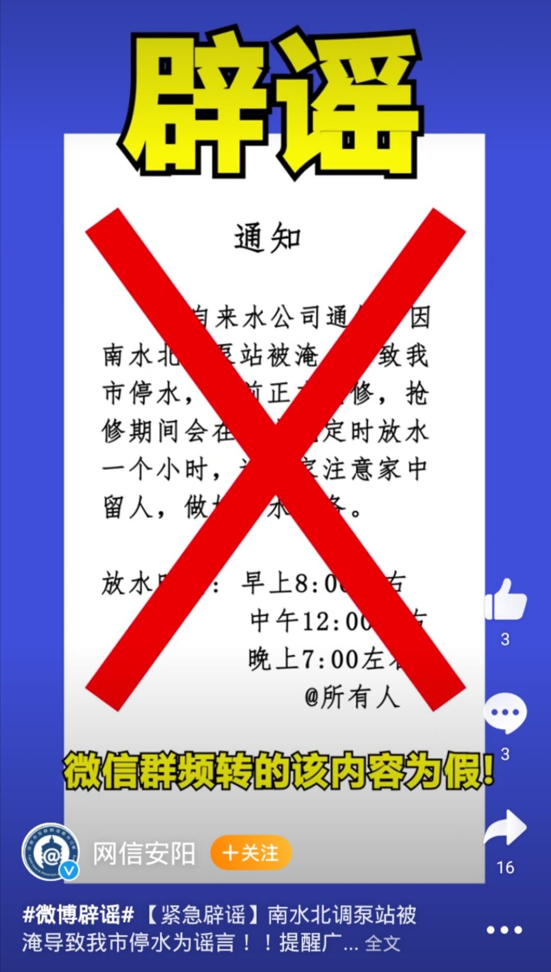 南水北調(diào)泵站被淹導(dǎo)致安陽(yáng)停水為謠言?。√嵝褟V大網(wǎng)民:面對(duì)自然災(zāi)害,我們要做到不信謠!不傳謠!不造謠!