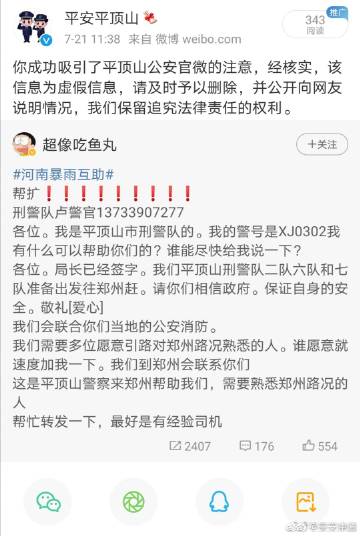 7月21日上午,有網(wǎng)友在新浪微博,聲稱自己是”平頂山市刑警隊(duì)的,警號(hào)XJ0302,平頂山刑警二隊(duì)、六隊(duì)、七隊(duì)準(zhǔn)備出發(fā)趕往鄭州支援,請(qǐng)求幫助轉(zhuǎn)發(fā)”,信息發(fā)出后引發(fā)大量不明真相網(wǎng)友轉(zhuǎn)發(fā)點(diǎn)贊。經(jīng)核實(shí),該信息為虛假信息。災(zāi)害當(dāng)前,請(qǐng)不要造謠傳謠,影響抗汛救災(zāi)。對(duì)于為了吸引關(guān)注,發(fā)布虛假信息干擾網(wǎng)絡(luò)秩序的,公安機(jī)關(guān)將依法嚴(yán)肅處理。