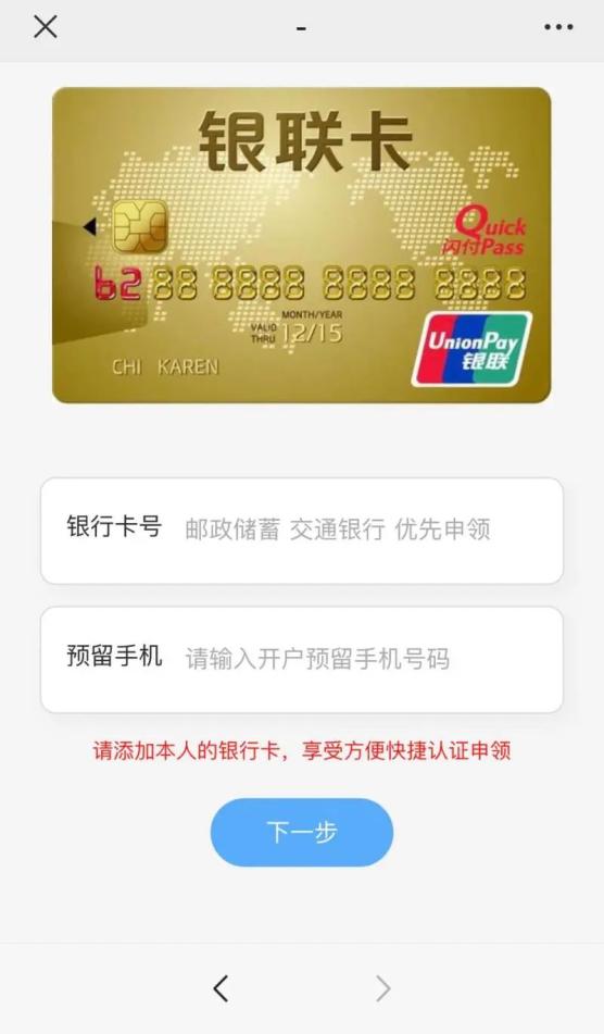 點(diǎn)擊“立即認(rèn)證”按鈕,跳轉(zhuǎn)到一個(gè)需要填寫銀行卡號和預(yù)留手機(jī)號的頁面,系統(tǒng)顯示郵儲銀行、交通銀行優(yōu)先申領(lǐng)。