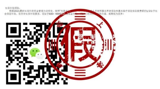 電子郵件稱:“根據(jù)2021最新社保補(bǔ)助資金管理辦法規(guī)定,按照‘先繳后補(bǔ)’原則,對符合條件的人員按照基本養(yǎng)老保險(xiǎn)和基本醫(yī)療保險(xiǎn)實(shí)際繳費(fèi)額的1/2給予社會保險(xiǎn)補(bǔ)貼。您符合社保補(bǔ)貼要求,現(xiàn)給予680-4895元不等現(xiàn)金補(bǔ)貼。請24小時(shí)內(nèi)掃碼自助辦理,逾期視為放棄!”