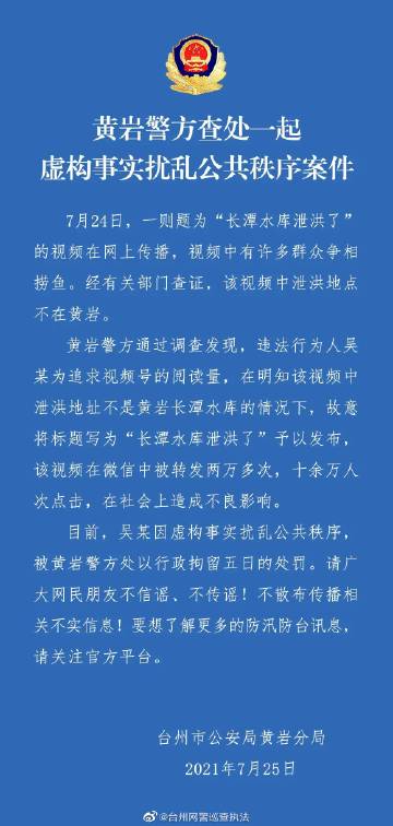 經(jīng)核實,該視頻為2020年10月發(fā)生在“海南三亞吉陽區(qū)頌和水庫”的一起群眾爭相撈魚事件。吳某某(男,53歲,溫嶺人)為了博人眼球,吸引關(guān)注,在自己微信視頻號上虛構(gòu)長潭水庫泄洪抓魚并發(fā)布視頻,該視頻在微信中被轉(zhuǎn)發(fā)兩萬多次,十余萬人次點擊,在社會上造成不良影響。經(jīng)批評教育,吳某某認識到了自己的行為錯誤并刪除了這條視頻。目前,吳某某已被黃巖警方處以行政拘留五日的處罰。