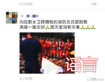 近日,網(wǎng)傳一則有關(guān)消防員犧牲的圖文消息,稱“向在新鄉(xiāng)衛(wèi)輝犧牲的消防員呂挺致敬!英雄一路走好,愿天堂沒有災(zāi)難”。消息引起社會各界關(guān)注。經(jīng)核實,沒有消防員犧牲,希望廣大網(wǎng)民不造謠、不信謠、不傳謠、不要轉(zhuǎn)發(fā)網(wǎng)上未經(jīng)核實的信息。