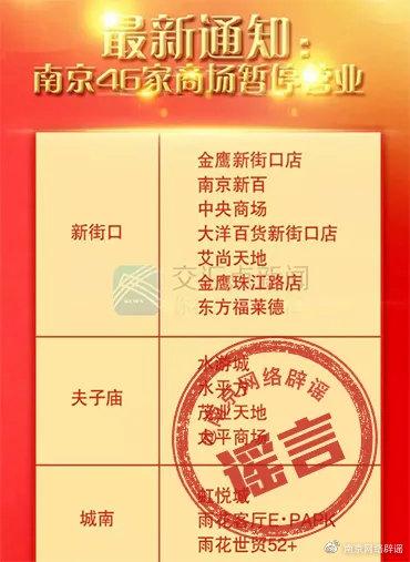 據(jù)舊聞顯示,截至2020年2月12日,南京共有48家商場暫停營業(yè)。稿件最初發(fā)布時(shí)間為2020年2月11日,圖中暫停營業(yè)商場數(shù)量為46家,后更新為47家,次日更新為48家。26日刷屏朋友圈的 “南京46家商場暫停營業(yè)”的長圖,是截取的2020年2月11日發(fā)布的內(nèi)容。疫情防控關(guān)鍵時(shí)刻,南京市互聯(lián)網(wǎng)信息辦公室呼吁廣大網(wǎng)民不造謠、不傳謠、不信謠,以官方發(fā)布的權(quán)威信息為準(zhǔn)。(記者 吳睿)
