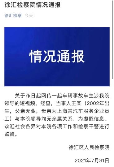 上海市徐匯區(qū)人民檢察院31日發(fā)布情況通報(bào)。通報(bào)稱:關(guān)于昨日起網(wǎng)傳一起車輛事故車主涉我院領(lǐng)導(dǎo)的短視頻,經(jīng)查,當(dāng)事人王某(2002年出生,父親無業(yè),母親為上海某汽車服務(wù)企業(yè)員工)與本院領(lǐng)導(dǎo)均無親屬關(guān)系,為虛假信息。