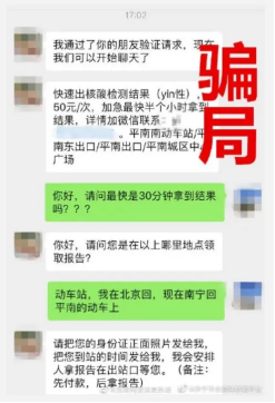 聊天群里出現(xiàn)“快速出核酸檢測結(jié)果”、“加急最快半個(gè)小時(shí)”、“家里也能做核酸檢測”的信息,只要額外付費(fèi)便能辦到,都是騙錢的套路。假的!假的!假的!不要轉(zhuǎn)賬! 核酸結(jié)果一定要在經(jīng)衛(wèi)健部門認(rèn)證的具備資質(zhì)的醫(yī)院、專業(yè)醫(yī)療機(jī)構(gòu)或第三方檢測機(jī)構(gòu)進(jìn)行檢測!