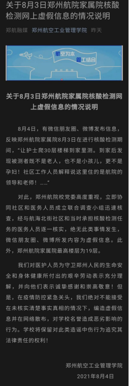 鄭州航院發(fā)布了關(guān)于8月3日鄭州航院家屬院核酸檢測網(wǎng)上虛假信息的情況說明: