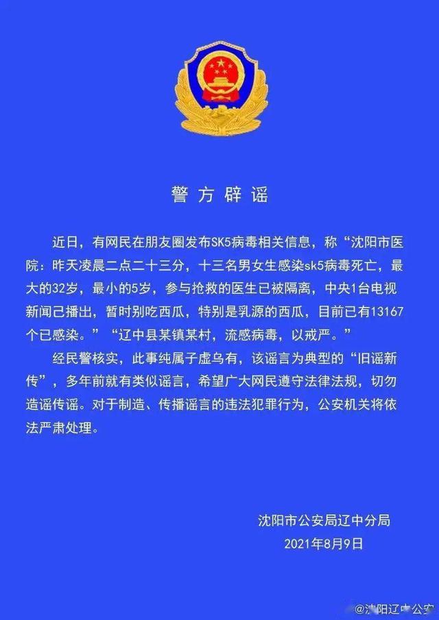 近日,有網(wǎng)民在朋友圈發(fā)布SK5病毒相關(guān)信息,稱“沈陽市醫(yī)院:昨天凌晨二點二十三分,十三名男女生感染SK5病毒死亡,最大的32歲,最小的5歲,參與搶救的醫(yī)生已被隔離,中央1臺電視新聞己播岀,暫時別吃西瓜,特別是乳源的西瓜,目前已有13167個已感染?!薄斑|中縣某鎮(zhèn)某村,流感病毒,以戒嚴(yán)?!?/p>
