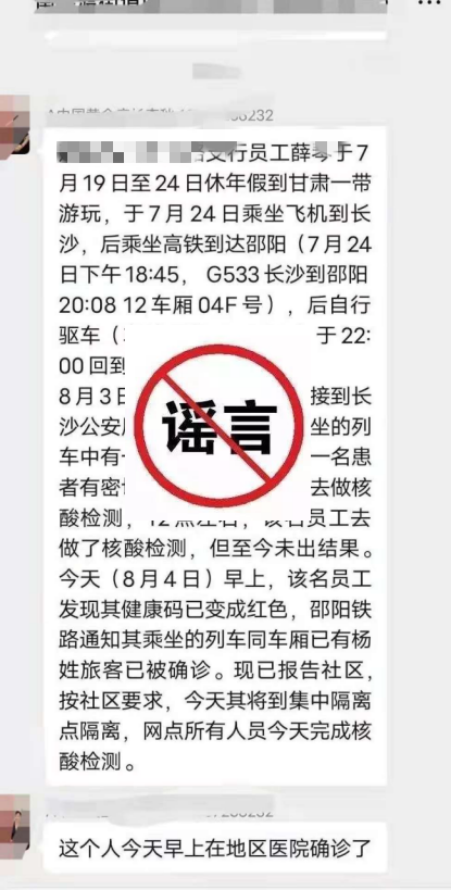 8月6日8時(shí),李某通過微信散播了兩條涉疫情信息:第一條信息上面有薛某的名字及工作單位、行程路線、與確診的新型冠狀病毒患者有接觸的時(shí)間節(jié)點(diǎn),稱社區(qū)已經(jīng)把這個(gè)人集中隔離;第二條信息中發(fā)布了“這個(gè)人今天早上在地區(qū)醫(yī)院確診了”,上述兩條信息被大量轉(zhuǎn)發(fā)流傳。零陵公安分局網(wǎng)安大隊(duì)發(fā)現(xiàn)上述兩條涉疫信息后,立即聯(lián)系南津渡派出所核查情況。