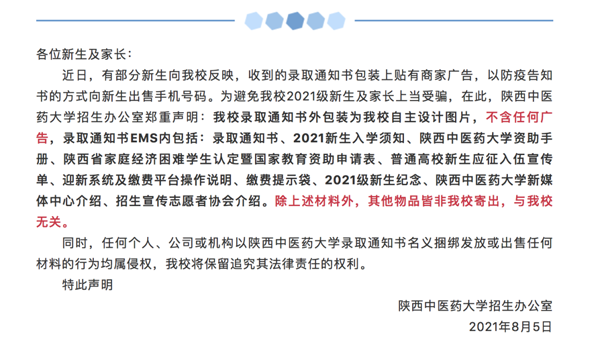 近日,陜西中醫(yī)藥大學發(fā)布關于新生錄取通知書的聲明。