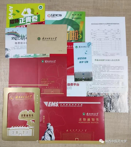 錄取通知書外包裝為該校自主設計圖片,不含任何廣告,錄取通知書EMS內(nèi)包括:錄取通知書、2021新生入學須知、陜西中醫(yī)藥大學資助手冊、陜西省家庭經(jīng)濟困難學生認定暨國家教育資助申請表、普通高校新生應征入伍宣傳單、迎新系統(tǒng)及繳費平臺操作說明、繳費提示袋、2021級新生紀念、陜西中醫(yī)藥大學新媒體中心介紹、招生宣傳志愿者協(xié)會介紹。