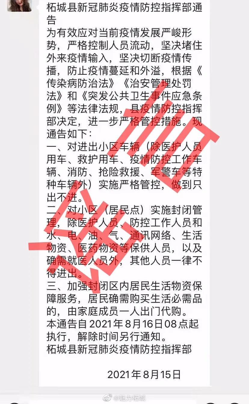 8月15日,柘城縣網(wǎng)信辦接網(wǎng)民舉報,有人在微信群傳播“對小區(qū)(居民點(diǎn))實(shí)施封閉管理”相關(guān)消息,經(jīng)向縣疫情防控指揮部核實(shí),該網(wǎng)傳信息為謠言。
