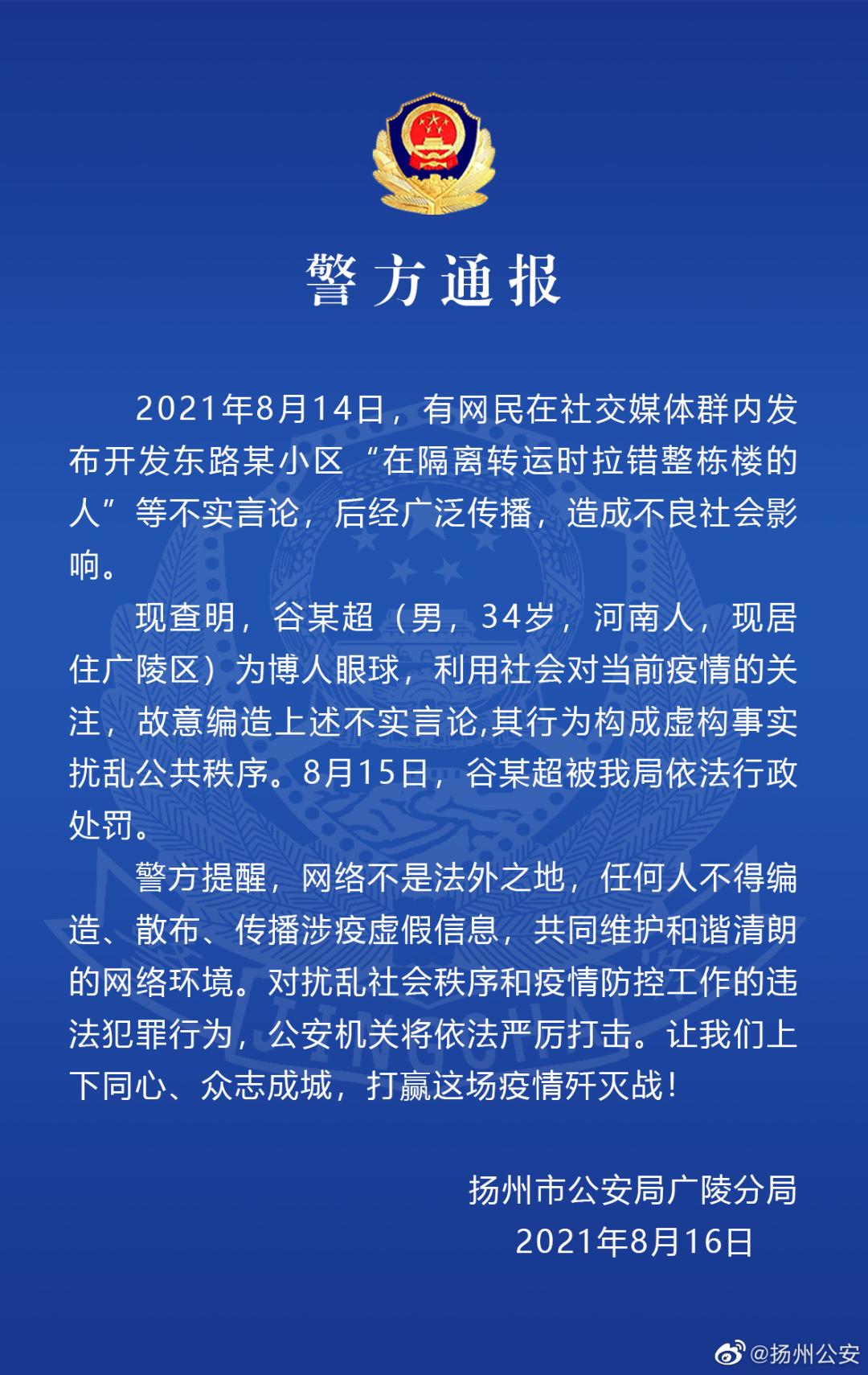 8月16日,江蘇省揚(yáng)州市公安局廣陵分局發(fā)布警方通報進(jìn)行辟謠。經(jīng)查明,谷某超(男,34歲,河南人,現(xiàn)居住廣陵區(qū))為博人眼球,利用社會對當(dāng)前疫情的關(guān)注,故意編造上述不實(shí)言論,其行為構(gòu)成虛構(gòu)事實(shí)擾亂公共秩序。8月15日,谷某超被揚(yáng)州市公安局廣陵分局依法行政處罰。(溫璐、李依環(huán)、實(shí)習(xí)生冷佩遙)