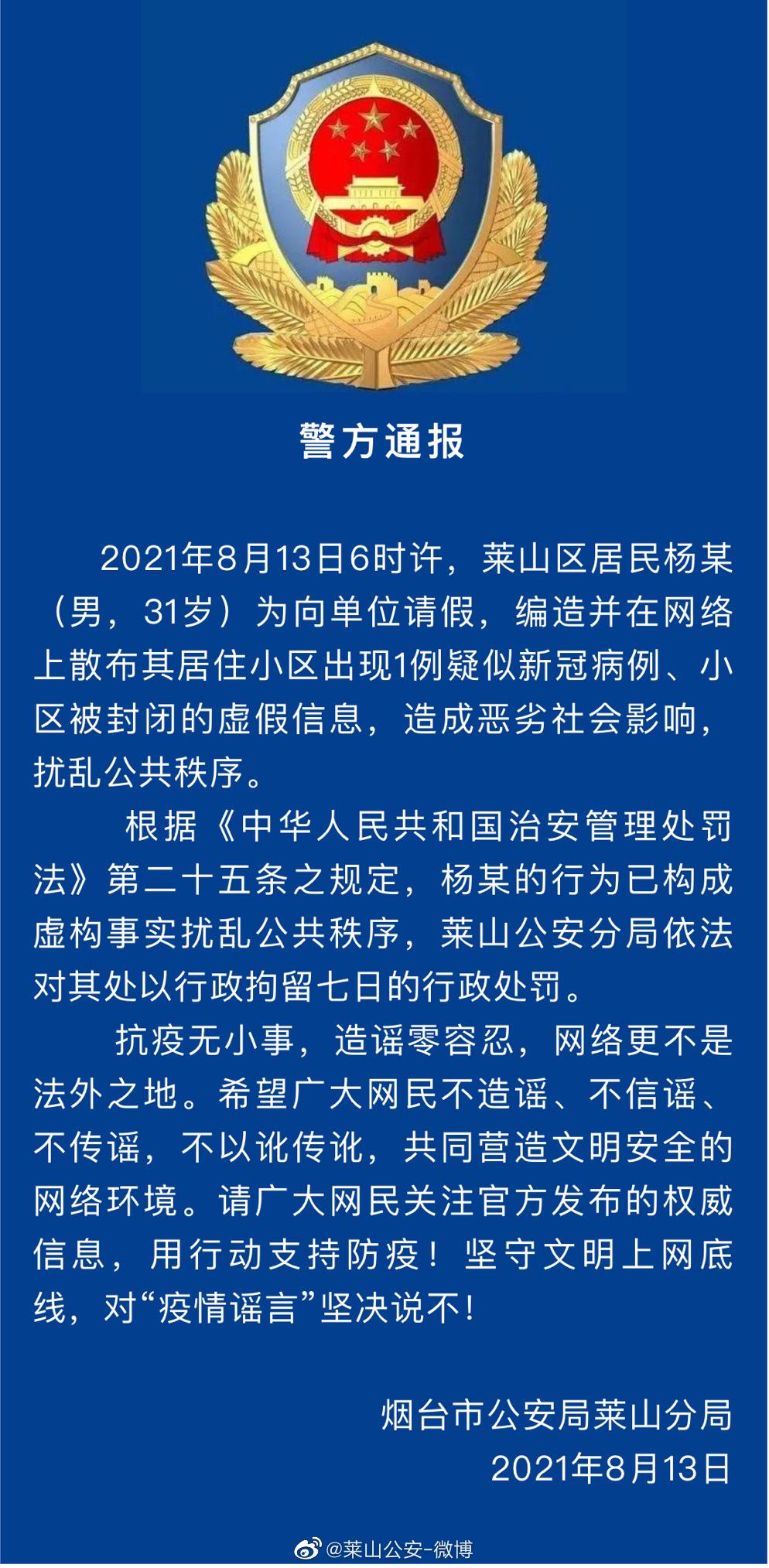8月13日煙臺市公安局萊山分局通報,此消息為虛假信息。經(jīng)查明,8月13日6時許,山東煙臺萊山區(qū)居民楊某(男,31歲)為向單位請假,編造并在網(wǎng)絡(luò)上散布其居住小區(qū)出現(xiàn)疑似新冠病例、小區(qū)被封閉的虛假信息,造成惡劣社會影響,擾亂公共秩序。目前楊某因虛構(gòu)事實(shí)擾亂公共秩序被萊山公安分局依法行政拘留7日。
