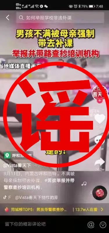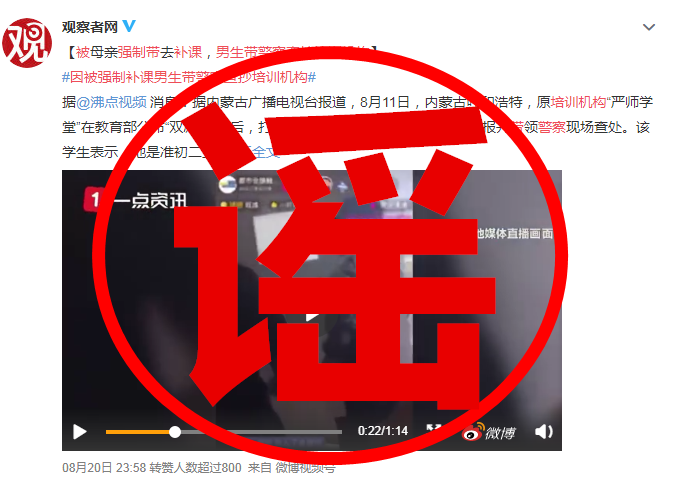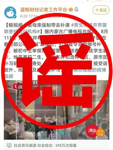 近日,抖音、微博、今日頭條等平臺(tái)中流傳“男孩不滿母親強(qiáng)制補(bǔ)課,帶警察查抄補(bǔ)課機(jī)構(gòu)”等不實(shí)言論。經(jīng)核查,上述不實(shí)言論是對(duì)內(nèi)蒙古廣播電視臺(tái)經(jīng)濟(jì)生活節(jié)目制作傳播中心《都市全接觸》欄目2021年8月11日抖音直播視頻斷章取義、惡意剪輯、歪曲事實(shí)而成,性質(zhì)極其惡劣。