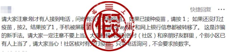 “有人接到陌生電話,問(wèn)有沒(méi)有接種疫苗。如果已接種疫苗,請(qǐng)按1;如果還沒(méi)打過(guò)疫苗,按2。結(jié)果有人按了1后,手機(jī)被屏蔽了,常用的PayMe和網(wǎng)上銀行資金都被轉(zhuǎn)移了。這是詐騙的新手法,請(qǐng)大家一定注意不要上當(dāng)。”