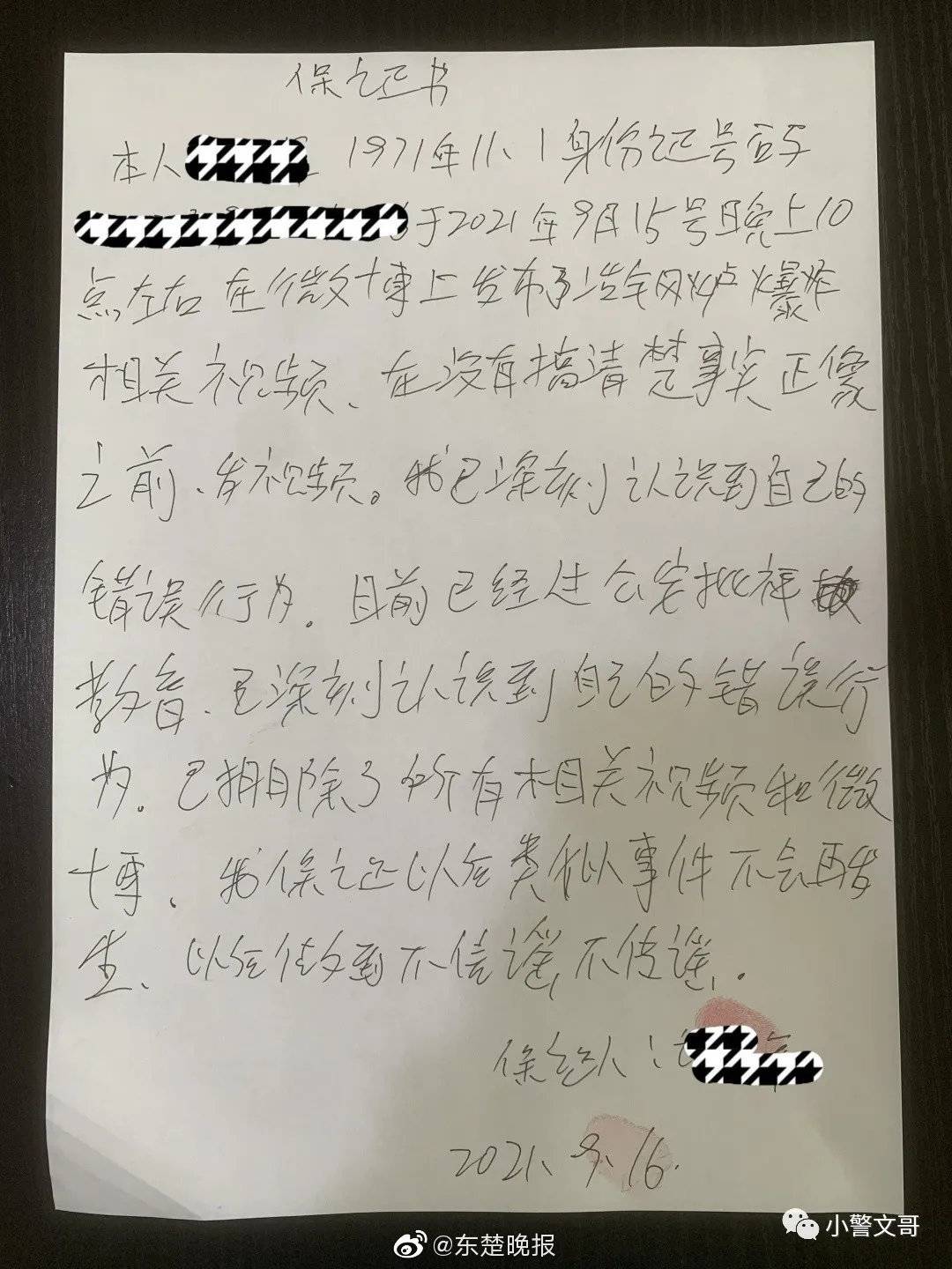 經(jīng)民警對(duì)許某批評(píng)教育,許某已認(rèn)識(shí)到自己的嚴(yán)重錯(cuò)誤,感到深深的自責(zé),并主動(dòng)撰寫了保證書,刪除了所有相關(guān)視頻和微博。保證以后不會(huì)再犯類似的事情了,不信謠不傳謠,做一個(gè)知法懂法的市民。