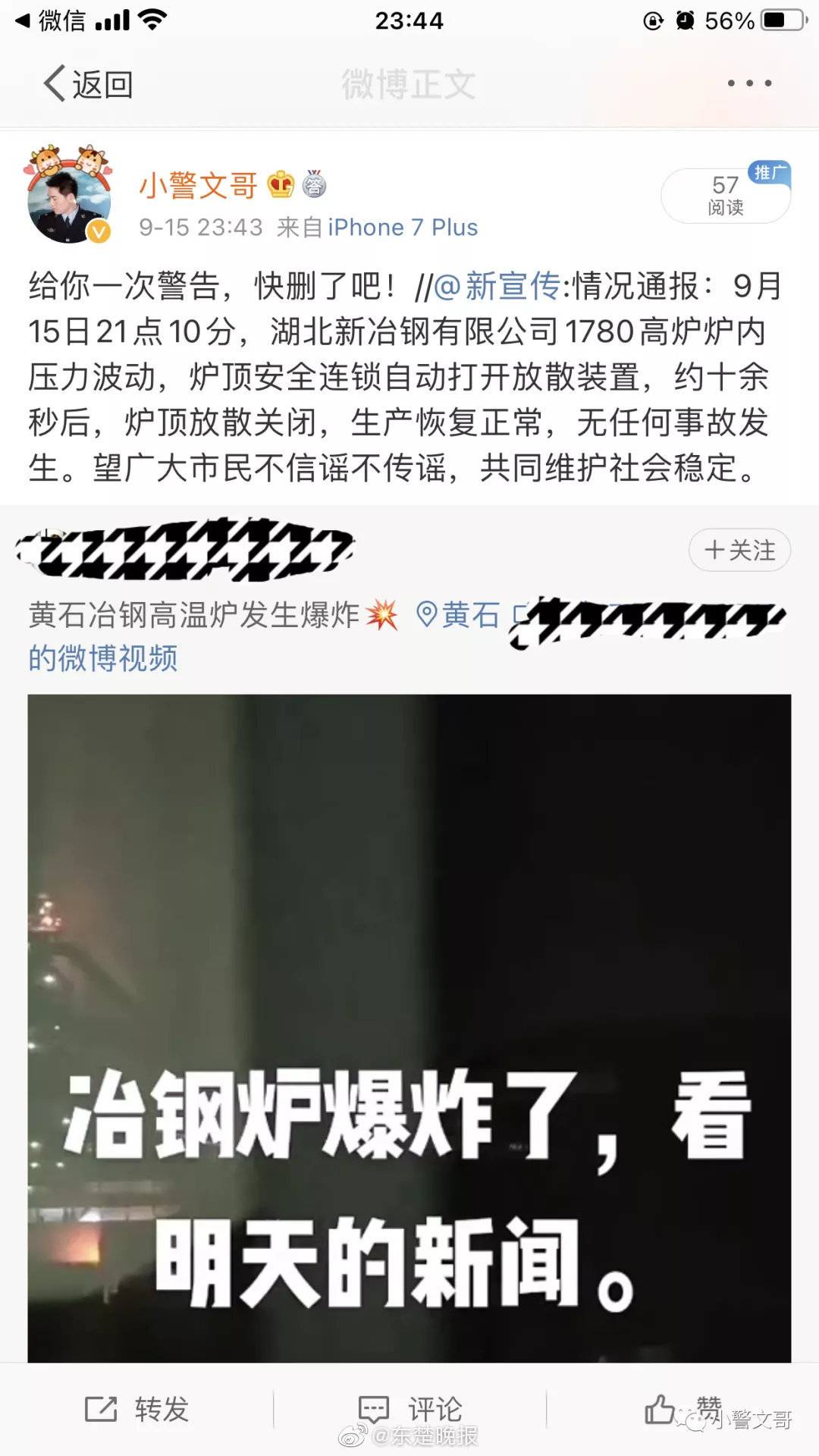 9月15日晚,一網(wǎng)民在微博發(fā)文稱“黃石冶鋼高溫爐發(fā)生爆炸……”。該視頻在微信群和微博中流傳引發(fā)眾多網(wǎng)友關(guān)注,當(dāng)然也引起了黃石民警的關(guān)注。