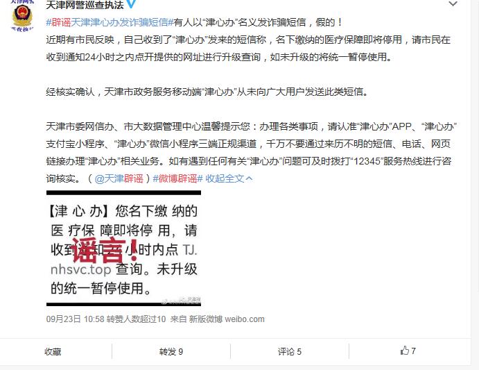 近期有市民反映,自己收到了“津心辦”發(fā)來的短信稱,名下繳納的醫(yī)療保障即將停用,請市民在收到通知24小時之內(nèi)點開提供的網(wǎng)址進(jìn)行升級查詢,如未升級的將統(tǒng)一暫停使用。
