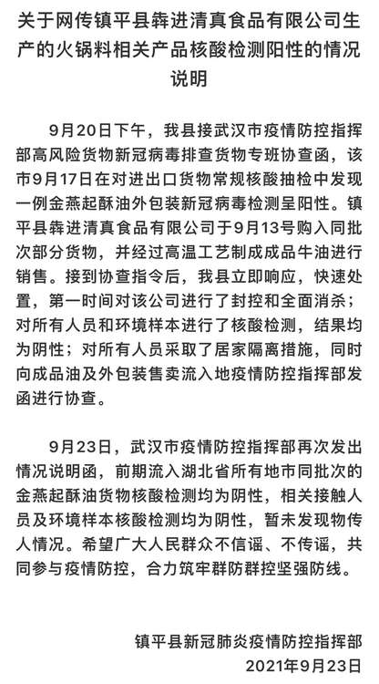 9月23日,武漢市疫情防控指揮部再次發(fā)出情況說明函,前期流入湖北省所有地市同批次的金燕起酥油貨物核酸檢測(cè)均為陰性,相關(guān)接觸人員及環(huán)境樣本核酸檢測(cè)均為陰性,暫未發(fā)現(xiàn)物傳人情況。