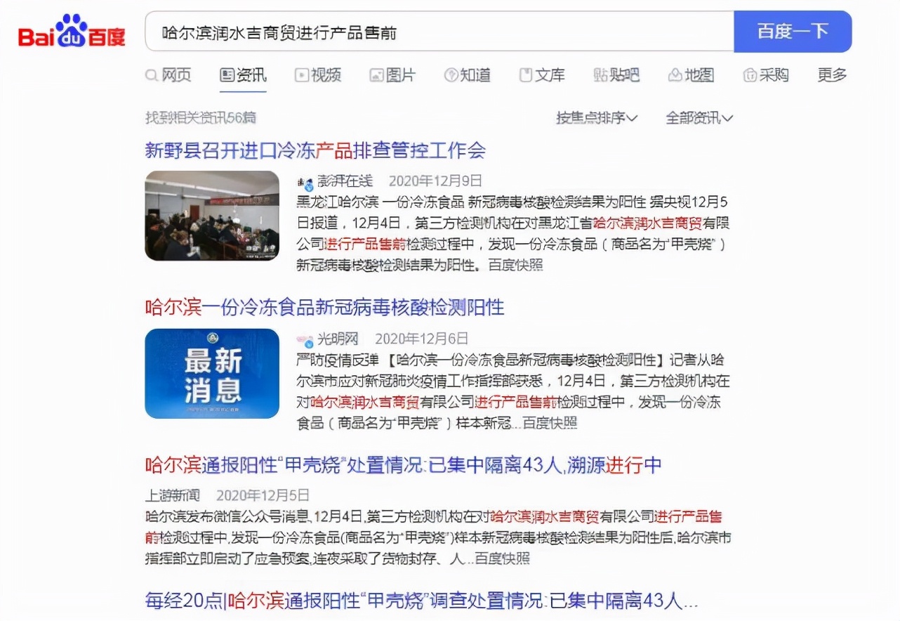 其次,根據(jù)網(wǎng)傳視頻中文字顯示是“12月4日哈爾濱潤水吉商貿(mào)進(jìn)行產(chǎn)品售前檢測過程中發(fā)現(xiàn)一份冷凍食品一份病毒核酸檢測結(jié)果為陽性”。