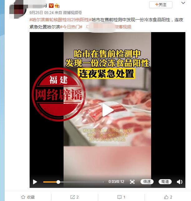 9月25日,有網(wǎng)民發(fā)文稱:#哈爾濱首輪核酸檢出29例陽性#哈市在售前檢測中發(fā)現(xiàn)一份冷凍食品陽性,連夜緊急處置。