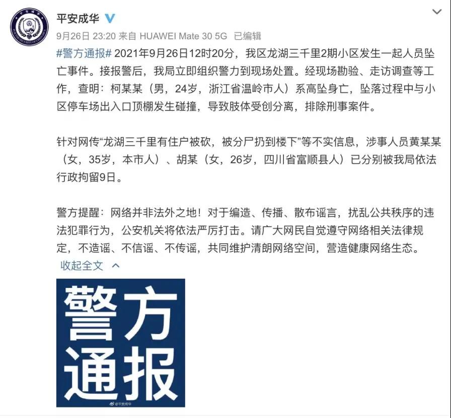 對此,@平安成華在微博發(fā)布通告進(jìn)行辟謠,“2021年9月26日12時(shí)20分,我區(qū)龍湖三千里2期小區(qū)發(fā)生一起人員墜亡事件。接報(bào)警后,我局立即組織警力到現(xiàn)場處置。經(jīng)現(xiàn)場勘驗(yàn)、走訪調(diào)查等工作,查明:柯某某(男,24歲,浙江省溫嶺市人)系高墜身亡,墜落過程中與小區(qū)停車場出入口頂棚發(fā)生碰撞,導(dǎo)致肢體受創(chuàng)分離,排除刑事案件?!痹诰W(wǎng)絡(luò)散布“分尸”謠言的黃某某和胡某也因此分別被公安局依法行政拘留9日。