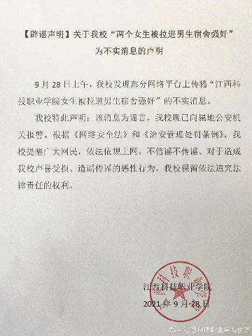 9月28日下午,江西科技職業(yè)學(xué)院發(fā)表聲明表示,該消息不實(shí)。