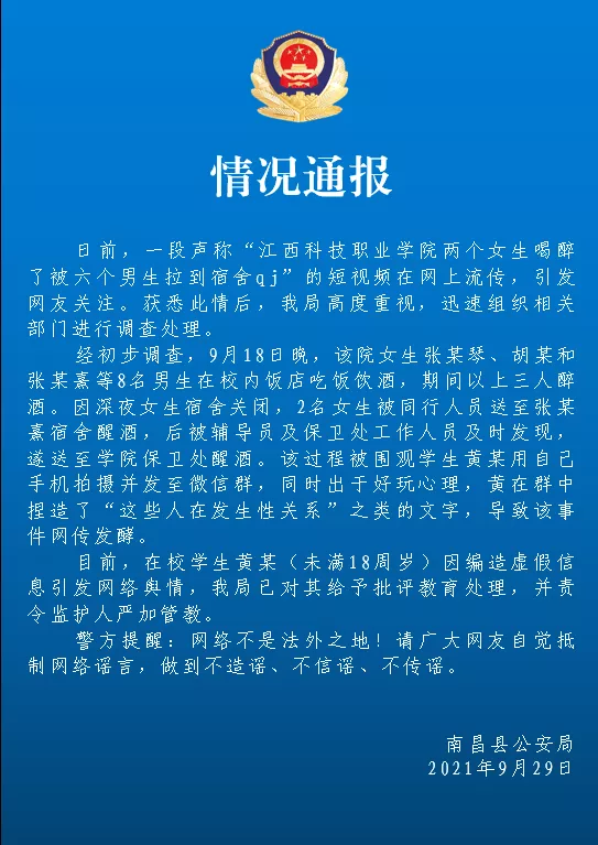 經(jīng)初步調(diào)查,9月18日晚,江西科技職業(yè)學(xué)院女生張某琴、胡某和張某熹等8名男生在校內(nèi)飯店吃飯飲酒,期間以上三人醉酒。因深夜女生宿舍關(guān)閉,2名女生被同行人員送至張某熹宿舍醒酒,后被輔導(dǎo)員及保衛(wèi)處工作人員及時(shí)發(fā)現(xiàn),遂送至學(xué)院保衛(wèi)處醒酒。該過(guò)程被圍觀學(xué)生黃某用自己手機(jī)拍攝并發(fā)至微信群,同時(shí)出于好玩心理,黃某在群中捏造了“這些人在發(fā)生性關(guān)系”之類(lèi)的文字,導(dǎo)致該事件網(wǎng)傳發(fā)酵。
