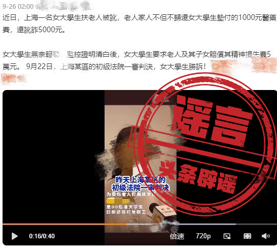 近日,網(wǎng)傳視頻稱,“上海一女大學(xué)生扶老人被訛”“老人家人不但不歸還1000元醫(yī)藥費,還訛詐5000元”。視頻中還提到,“上海某區(qū)的初級(人民)法院一審判決結(jié)果:鑒于老人年紀過大,免于刑罰,但其子女將面臨15日的拘留懲罰。同時公開道歉,并賠償女大學(xué)生精神損失費56000元。”