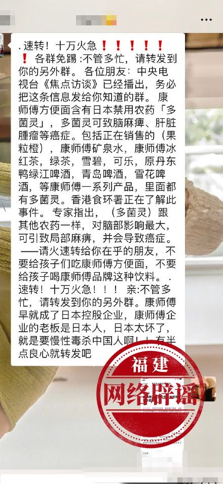 近日,網(wǎng)上熱傳康師傅方便面、果粒橙、可口可樂、雪花啤酒等含有日本禁用農(nóng)藥多菌靈,可引致腦局部麻痹,并會導(dǎo)致癌癥。同時(shí),聲稱中央電視臺《焦點(diǎn)訪談》已經(jīng)播出,香港食環(huán)署正在了解此事件。