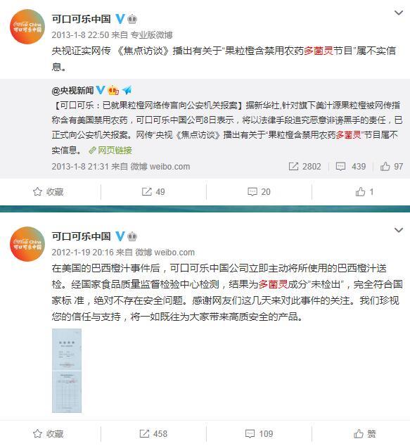 可口可樂中國2012年1月回應(yīng):經(jīng)國家食品質(zhì)量監(jiān)督檢驗(yàn)中心檢測,結(jié)果為未檢出“多菌靈成分”,完全符合國家標(biāo)準(zhǔn),絕對不存在安全問題。可口可樂中國2013年1月再次澄清:央視證實(shí)網(wǎng)傳 《焦點(diǎn)訪談》播出有關(guān)于“果粒橙含禁用農(nóng)藥多菌靈節(jié)目”屬不實(shí)信息。