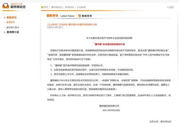 2012年9月,康師傅控股有限公司發(fā)布了立場說明:“康師傅”是代表中國特色的民族品牌,并受到認(rèn)可。在配合政府推動(dòng)改革開放的過程中,企業(yè)引進(jìn)外資參股并非特例,不應(yīng)被差別對待。