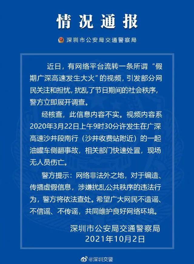 深圳警方發(fā)布情況通報(bào),正式辟謠!經(jīng)核查,此信息內(nèi)容不實(shí)。視頻內(nèi)容系2020年3月22日上午9時(shí)30分許發(fā)生在廣深高速沙井段南行(沙井收費(fèi)站附近)的一起油罐車側(cè)翻事故,相關(guān)部門快速處置,現(xiàn)場(chǎng)無(wú)人員傷亡。視頻引發(fā)部分網(wǎng)民關(guān)注和擔(dān)憂,擾亂了節(jié)日期間的社會(huì)秩序