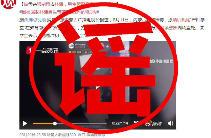 近日,抖音、微博、今日頭條等平臺(tái)中流傳“男孩不滿母親強(qiáng)制補(bǔ)課,帶警察查抄補(bǔ)課機(jī)構(gòu)”等不實(shí)言論。經(jīng)核查,上述不實(shí)言論是對(duì)內(nèi)蒙古廣播電視臺(tái)經(jīng)濟(jì)生活節(jié)目制作傳播中心《都市全接觸》欄目2021年8月11日抖音直播視頻斷章取義、惡意剪輯、歪曲事實(shí)而成,性質(zhì)極其惡劣。