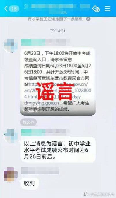 6月22日,接網(wǎng)友私信,有不少考生家長在微信群、QQ群傳播“6月23號下午18時至6月26日18時開放成績查詢?nèi)肟冢梢圆樵冎锌汲煽儭币粍t信息。經(jīng)核實,該信息為虛假信息,請廣大市民朋友不信謠、不傳謠,停止發(fā)布、轉(zhuǎn)發(fā)此種信息。