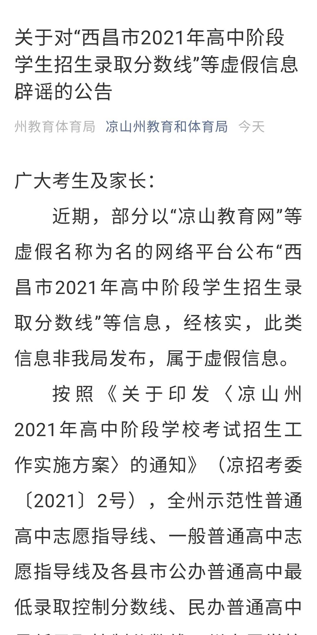 6月23日,涼山州教育和體育局發(fā)布辟謠公告,經(jīng)核實(shí),近期部分以“涼山教育網(wǎng)”等虛假名稱為名的網(wǎng)絡(luò)平臺,公布“西昌市2021年高中階段學(xué)生招生錄取分?jǐn)?shù)線”等信息,屬于虛假信息。