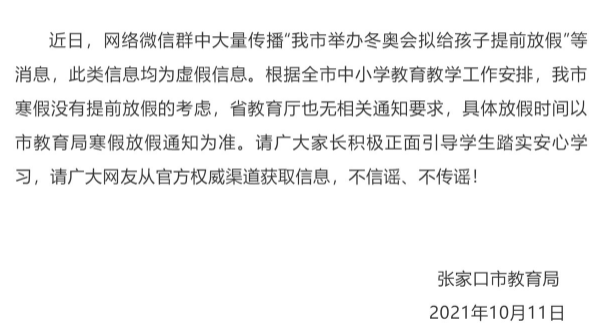 近日,網(wǎng)傳“張家口市舉辦冬奧會擬給學(xué)生提前放假”等消息。