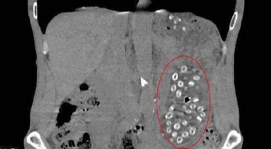 經(jīng)CT檢查后發(fā)現(xiàn)胃潴留,胃內(nèi)可見大量顆粒狀物體,密密麻麻,詢問得知王大伯近期大量食用楊梅且不吐核,以下影像中呈現(xiàn)的就是沒有消化的楊梅核。