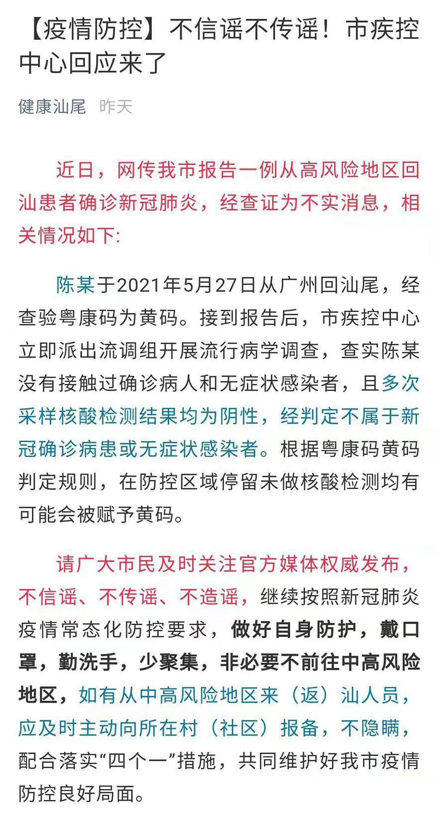 據(jù)“健康汕尾”微信公眾號(hào)消息,近日,網(wǎng)傳汕尾市報(bào)告一例從高風(fēng)險(xiǎn)地區(qū)回汕患者確診新冠肺炎,經(jīng)查證為不實(shí)消息,相關(guān)情況如下: