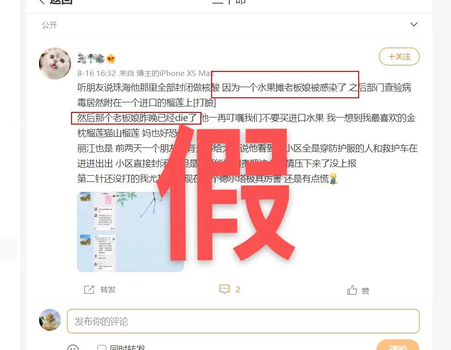 近日,網(wǎng)傳“珠海下柵一個水果店老板娘因進口榴蓮,感染榴蓮?fù)獍b上新冠病毒而死亡”,“珠海銘海水果批發(fā)市場從廣西進貨一批榴蓮上檢查出新冠陽性病毒,現(xiàn)在密切接觸該批貨物的4個商戶,17工作人員已經(jīng)全部封閉和隔離”。
