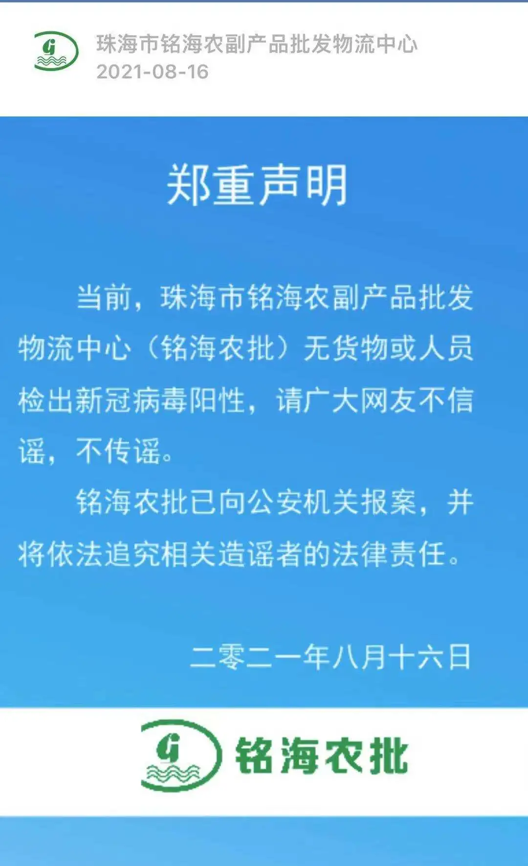 8月16日,珠海市銘海農(nóng)副產(chǎn)品批發(fā)物流中心(銘海農(nóng)批)通過官方渠道發(fā)布聲明稱:“無貨物或人員檢出新冠病毒陽性,請廣大網(wǎng)友不信謠,不造謠”。