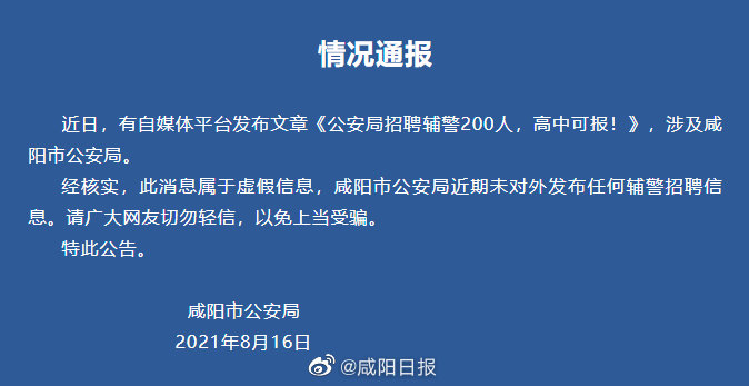 咸陽公安發(fā)布通報:此消息屬于虛假信息。