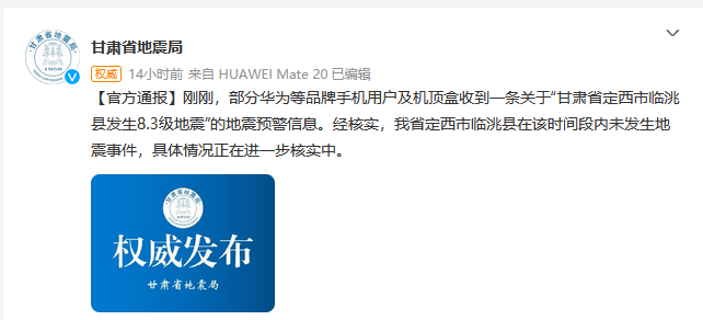10月13日下午,部分手機(jī)用戶及機(jī)頂盒收到一條關(guān)于“甘肅省定西市臨洮縣發(fā)生8.3級地震”的地震預(yù)警信息。經(jīng)甘肅省地震局核實(shí),甘肅省定西市在該時(shí)間段內(nèi)未發(fā)生地震事件。