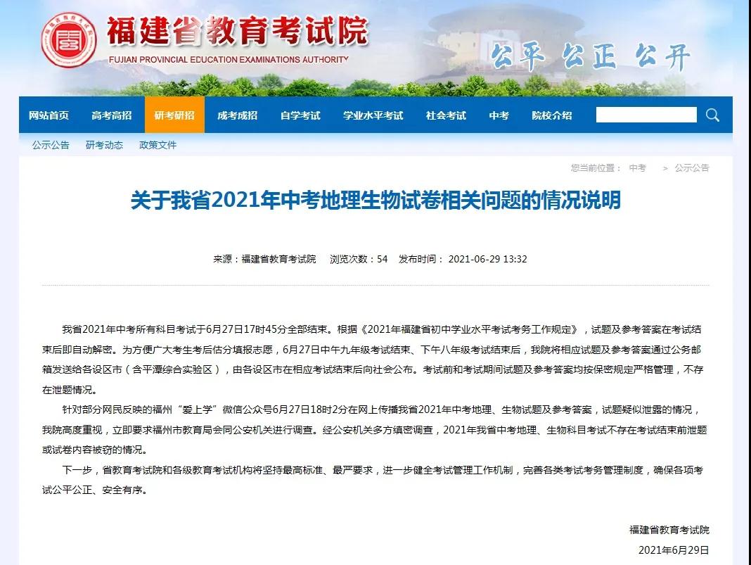 針對部分網(wǎng)民反映的福州“愛上學(xué)”微信公眾號6月27日18時2分在網(wǎng)上傳播福建省2021年中考地理、生物試題及參考答案,試題疑似泄露的情況,福建省教育考試院高度重視,立即要求福州市教育局會同公安機(jī)關(guān)進(jìn)行調(diào)查。經(jīng)公安機(jī)關(guān)多方縝密調(diào)查,2021年福建省中考地理、生物科目考試不存在考試結(jié)束前泄題或試卷內(nèi)容被竊的情況。