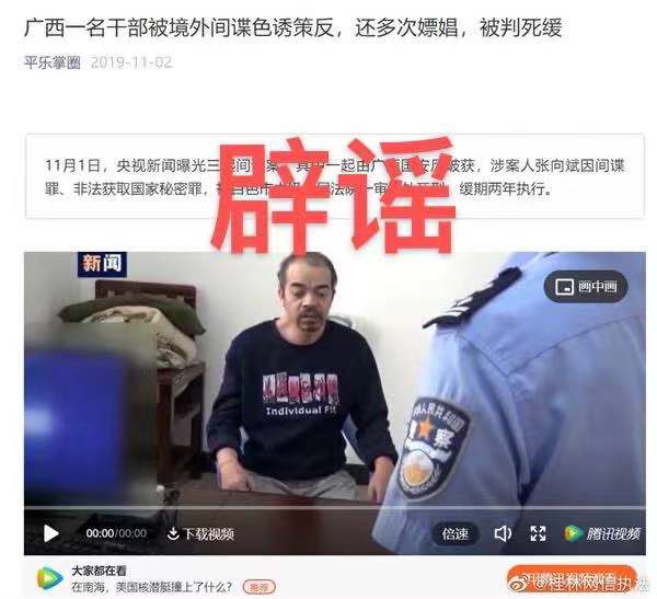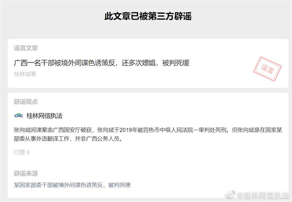 近日,桂林網(wǎng)信辦對此辟謠,表示張向斌間諜案先前由廣西國安廳破獲,張向斌于2019年被百色市中級人民法院一審判處死刑。但張向斌是在國家某部委從事外語翻譯工作,并非廣西公務人員。同時,微信公眾平臺已經(jīng)對該公眾號進行處罰。 ????