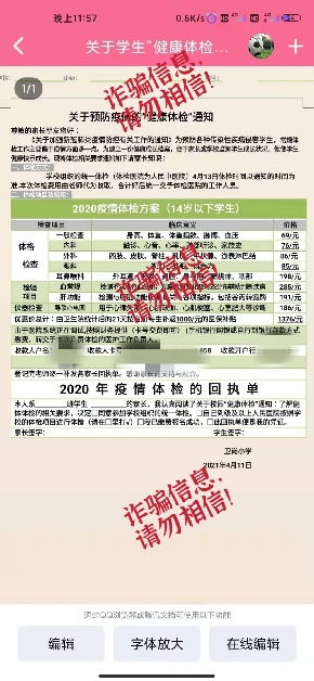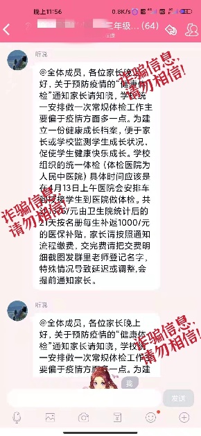 近日,安徽省合肥市的周先生收到一條來自孩子學校QQ群的消息,一名“老師”在班級群里發(fā)了一份關(guān)于“預防疫情的健康體檢”的通知,通知稱要給學生們建立一份健康成長檔案,便于家長或?qū)W校監(jiān)測孩子成長情況,學校組織了統(tǒng)一體檢,體檢費用合計1376元,由衛(wèi)生院統(tǒng)計,21天后按名冊每人補返1000元的醫(yī)保補貼。