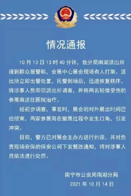 據(jù)悉,視頻顯示內(nèi)容為10月13日發(fā)生于南寧市會(huì)展中心的打架事件,系展會(huì)對(duì)外展出事件結(jié)束后,兩家參展商在撤展過程中發(fā)生口角,引發(fā)沖突。并非發(fā)生于天津市糖酒商品交易會(huì)上。