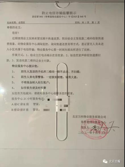 “近期,接到業(yè)主反映有冒充順豐快遞送貨,然后給業(yè)主發(fā)收款二維碼收取快遞費的現(xiàn)象,我們調(diào)取了監(jiān)控、詢問了快遞送貨員,查證冒充人員并未進入小區(qū)內(nèi),而是采取了電信詐騙的方式,他的作案手段就是先給業(yè)主打電話確認業(yè)主沒在家,然后聲稱有到付快遞,發(fā)送收款二維碼讓業(yè)主付款。我們已經(jīng)第一時間向派出所報了警,并且在業(yè)主群和各樓門的公告欄發(fā)布了提醒。”榮尊堡物業(yè)項目經(jīng)理董冬冬說,需要提醒大家,陌生人來電需警惕,一定要核實清楚,陌生人發(fā)送的鏈接和二維碼一律不點擊、不掃描。