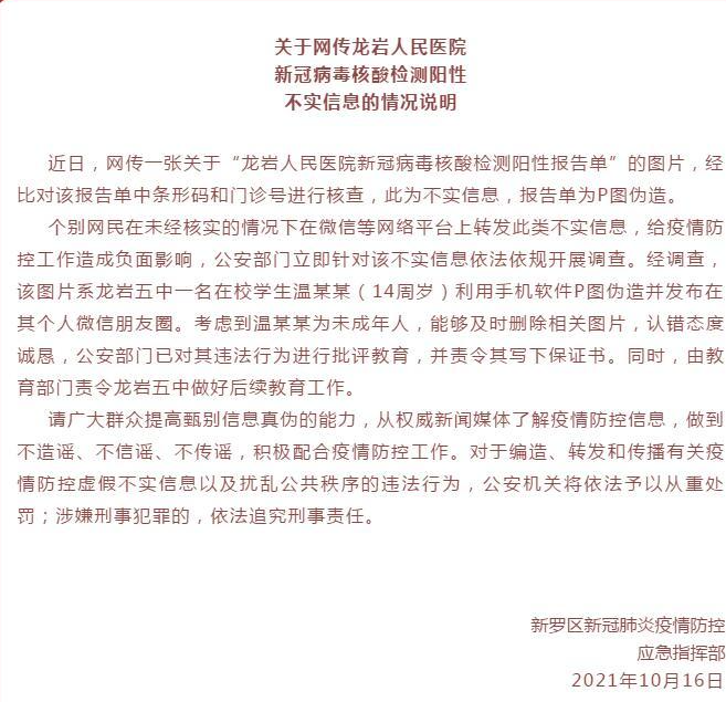 近日,網(wǎng)傳一張“龍巖人民醫(yī)院新冠病毒核酸檢測陽性報(bào)告”的圖片。