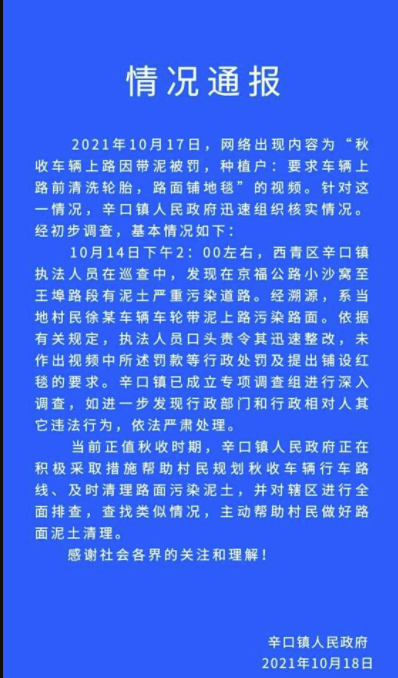 近日,網(wǎng)上有視頻稱“天津市辛口鎮(zhèn)秋收車輛上路因帶泥被罰。要求種植戶上路前清洗輪胎,且在路面上鋪紅毯?!?/p>